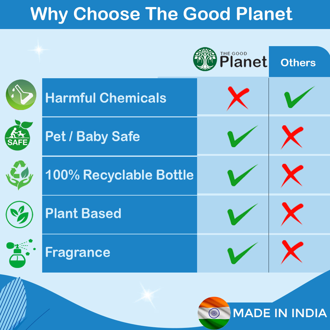 At The Good Planet, we use 100% plant-based, biodegradable ingredients, free from harsh chemicals, sulfates, and artificial fragrances. Our formulas are powered by natural surfactants, essential oils, and botanical extracts that are safe for your home and the environment.